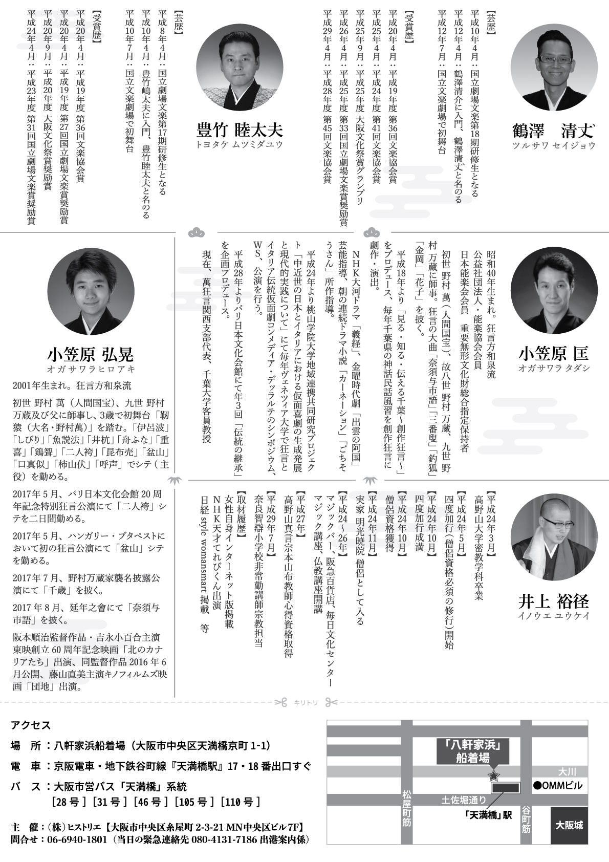 竹本千歳太夫、豊竹呂勢太夫、豊竹睦太夫、豊竹靖太夫、鶴澤清介、鶴澤清志郎、鶴澤清丈、鶴澤清公、吉田一輔、吉田玉佳、桐竹紋臣、桐竹紋秀、吉田玉勢、桐竹紋吉、吉田玉翔、吉田玉誉、吉田簑次、吉田玉彦、桐竹勘介、吉田玉路、吉田簑之、吉田簑悠